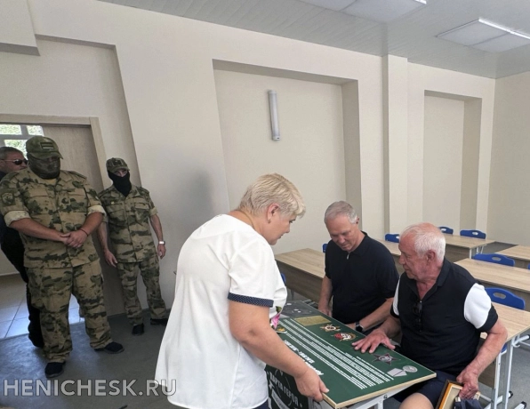 В Геническе представители территориального управления Росгвардии посетили одну из школ города вместе с народным артистом России Сергеем Гармашом и губернатором региона Владимиром Сальдо.