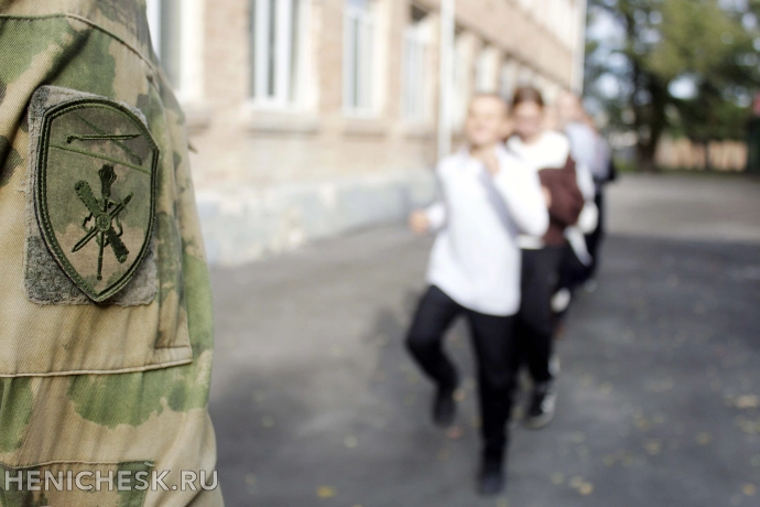 Военнослужащие Управления Росгвардии по Херсонской области провели практическое занятие по строевой подготовке с воспитанниками подшефного кадетского класса санаторной школы-интерната в Геническе.