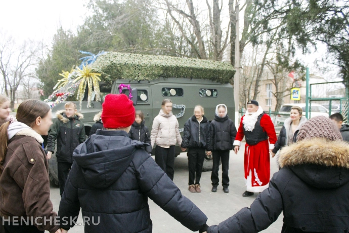 В рамках ведомственной акции «Дед Мороз специального назначения» главный волшебник ведомства прибыл к воспитанникам Генической санаторной школы-интернат на боевом автомобиле и привез сладкие подарки для праздничного стола, которые ребята доставали из военных ящиков.